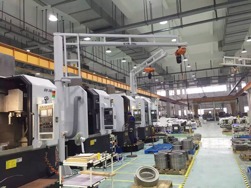 2噸立柱式懸臂吊旋轉一部分分成手動式和電動式旋轉(擺線針減速機減速劑安裝與上墊板或是下墊板上推動轉管懸臂旋轉)。環鏈電動葫蘆安裝在懸臂路軌上,用以吊裝吊物。
