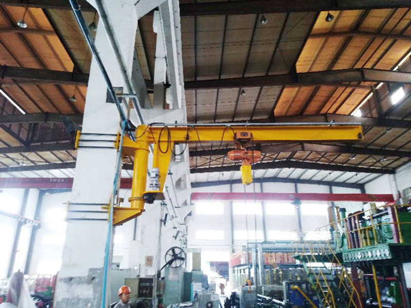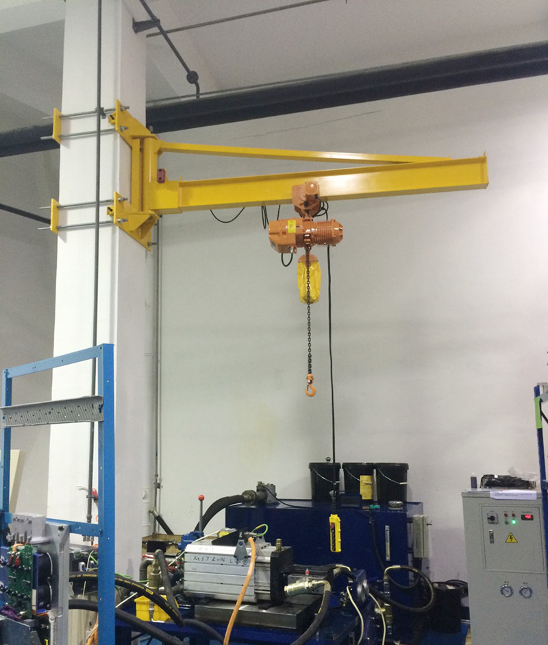 懸臂吊起重機(jī)工作強(qiáng)度為輕型,起重機(jī)由立柱,回轉(zhuǎn)臂回轉(zhuǎn)驅(qū)動(dòng)裝置及電動(dòng)葫蘆組成,立柱下端通過(guò)地腳螺栓固定在混凝土基礎(chǔ)上,由擺線針輪減速裝置來(lái)驅(qū)動(dòng)懸臂回轉(zhuǎn),環(huán)鏈電動(dòng)葫蘆在懸臂工字鋼上作左右直線運(yùn)行,并起吊重物。起重機(jī)旋臂有箱形梁結(jié)構(gòu),和型鋼結(jié)構(gòu),自重輕,跨度大,起重量大,經(jīng)濟(jì)耐用。