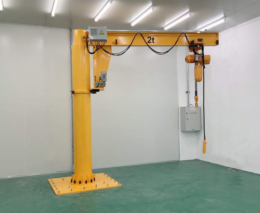 立柱式旋臂吊立桿選用圓鋼管生產制造,兩邊分別電焊焊接底版和圓弧,上端安裝腰圈路軌。底版根據化學螺栓與水泥地面聯接固定不動,確保懸臂吊的可靠性。圓弧上打有形孔,建立電纜線從立桿內部隱蔽工程裝線。